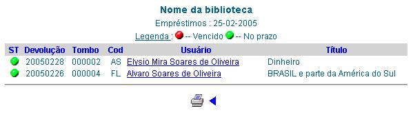 - ST: Apresenta o status da operação de empréstimo através de esferas coloridas. A esfera verde indica que o objeto está dentro do prazo de devolução e a esfera vermelha irá indicar os objetos com prazo de devolução vencido;