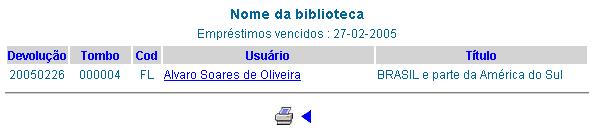 - Usuário: Apresenta o nome do usuário que está de posse do objeto. O nome é apresentado em forma de link para seu endereço eletrônico (e-mail). Clicando sobre o link, o funcionário responsável pela rotina de empréstimo pode se comunicar com o usuário através de e-mail;