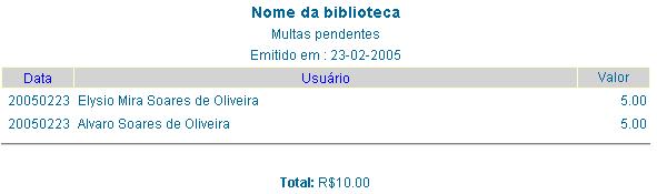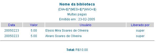 Apresenta uma tabela com 4 colunas contendo a data, o nome, o valor do débito quitado de cada usuário e o nome do bibliotecário que recebeu a multa. O título de cada coluna se constitue em um link de ordenação dos dados da coluna. No rodapé da tabela é apresentado o total arrecadado com o pagamento das multas.