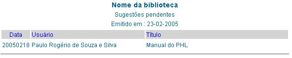 Apresenta uma tabela com 3 colunas contendo a data da sugestão de compra, o nome do usuário que efetuou a sugestão e o título do objeto sugerido. O título de cada coluna se constitue em um link de ordenação dos dados da coluna.