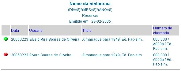 Apresenta uma tabela com 5 colunas contendo o status da disponibilidade, data da reserva, nome do usuário, título do objeto e seu número de chamada. Na coluna de status a esfera verde indica que há objetos disponíveis para empréstimo para aquele usuário. A esfera vermelha indica que não há disponibilidade de objeto para aquele usuário.