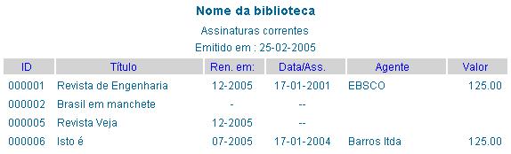 Apresenta uma tabela com 6 colunas contendo o MFN do registro no kardex, o título do periódico, a data de renovação, a data da assinatura corrente, o agente e o valor pago pela assinatura.